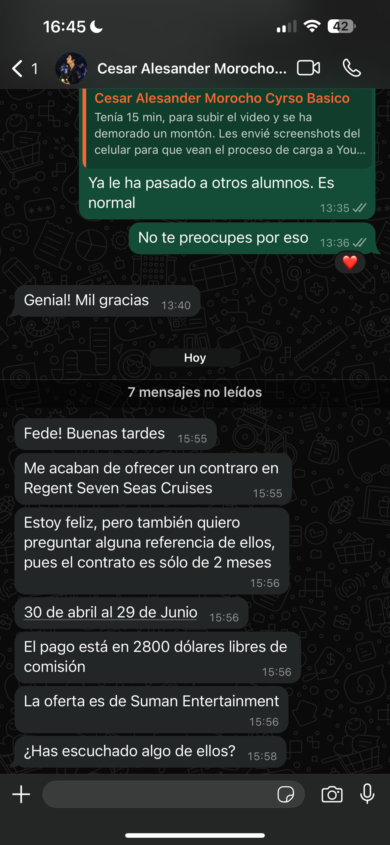 Desde 2016 hasta 2019 ha trabajado como músico de sesión para la empresa Carnival Cruise Lines, tanto en orquesta como en showband.